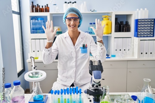 Brunette woman working at scientist laboratory showing and pointing up with fingers number ten while smiling confident and happy.