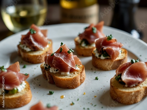 Bruschetta topped with prosciutto crudo, elegantly paired with white wine.