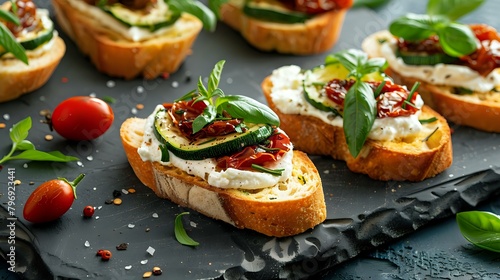 Bruschetta with Cream Cheese, Zucchini, Dried Tomato, and Herb Toast Delicious Canapé