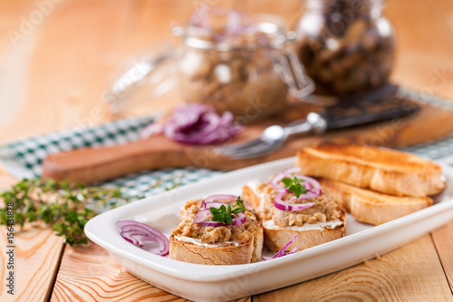 Bruschetta with mushroom caviar. Mushrooms. Selective focus. Copy space for text