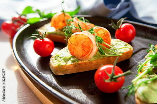 Bruschetta with stewed salmon, cucumber and sauce "Wasabi" and glass of white wine
