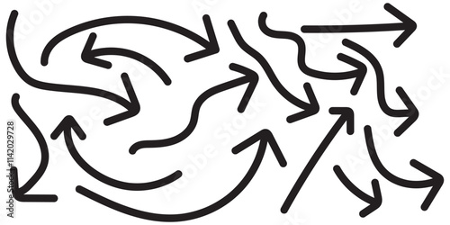 Brush, marker drawn bold arrows set. Collection of hand drawn doodle thick arrows in different directions. Set of Hand drawn vector arrows doodle on white background. design element vector .