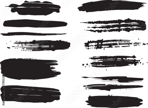 Brush set. Vector black paint brush spots, highlighter lines or felt-tip pen marker. Ink smudge abstract shape stains and smear set with texture