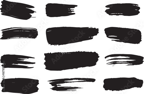 Brush set. Vector black paint brush spots, highlighter lines or felt-tip pen marker. Ink smudge abstract shape stains and smear set with texture. Hand drawn vector illustration