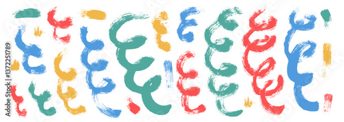 Brush stroke vector paint squiggles lines. Hand drawn kids confetti. Linear dye scribble elements set isolated on white background. Doodle party spirals celebration decoration..