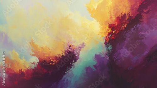 Brushstroke dance across canvas, blending rich hues of yellow, purple, turquoise, and red in a vivid abstract.