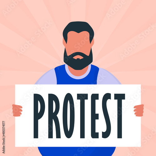 Brutal man with a banner in his hands. Protest concept. Cartoon style.