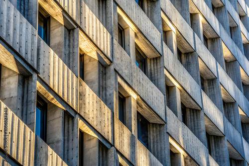Brutalism Textured concrete building facade with sunlight casting shadows through window frames, creating a striking visual pattern.