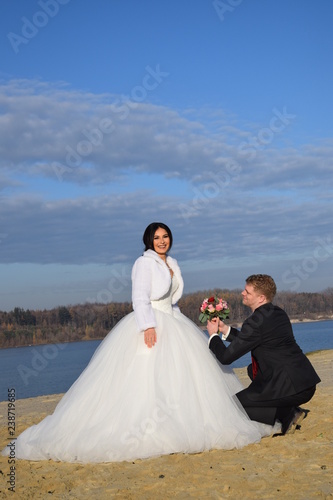 Bräutigam kniet mit Blumenstrauß vor seiner Braut am Strand