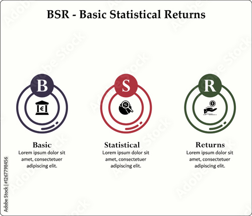 BSR - Basic Statistical Returns acronym. Infographic template with icons and description placeholder