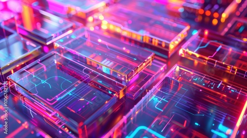 bstract glowing cubes with circuit motifs float in a virtual space, showcasing a sleek and modern technology environment.