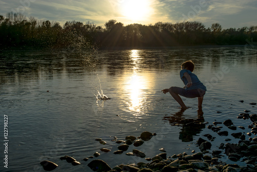 Bub wirft Steine in Fluss bei Sonnenuntergang