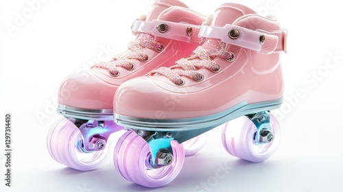 Bubblegum Pink Roller Skates with Metallic Accents and Sparkly Wheels Isolated on White Background. Generative AI
