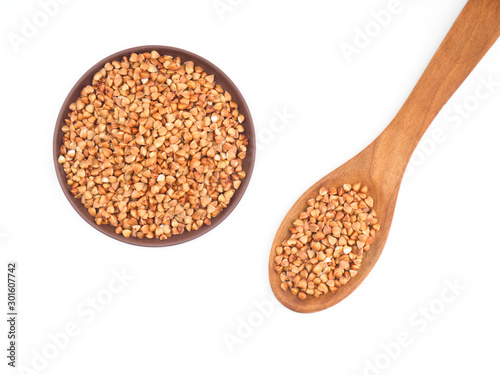 Buckwheat groats in clay plate and in wooden spoon on white background. Weight loss concept