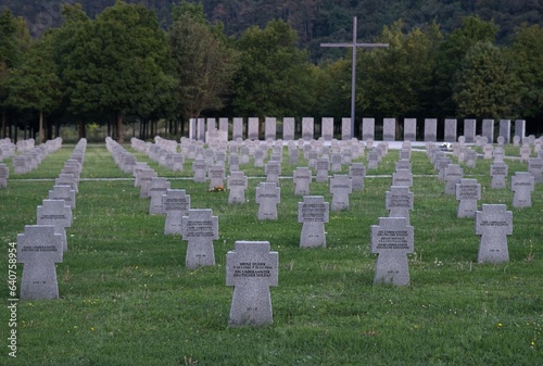 Budaors, Hungary - Aug 18, 2023: German Second World War cemetery in Budaors. This war cemetery contains 14,000 German and 600 Hungarian war graves. Summer sunny day. Selective focus.