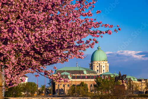 Budapest, Hungary - Beautiful blooming pink japanese cherry trees at Arpad Toth promenade (Toth Arpad setany) in Castle District on a sunny spring afternoon with Buda Castle Royal Palace at background