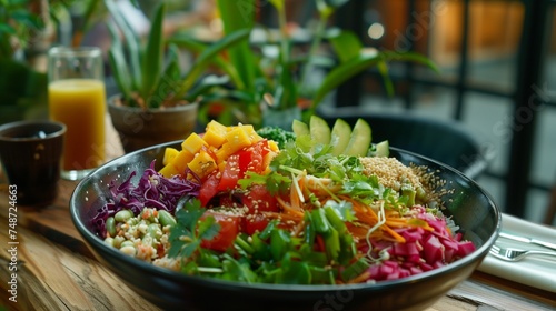 Buddha bowl filled with a variety of colorful and nutritious ingredients, protein, vegetables and carbohydrates.