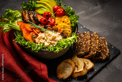 Buddha bowl with vegetables, healthy salad with avocado, carrots, corn and rice, baked chicken breast on a black background. Healthy eating concept. Copyspace. High quality photo