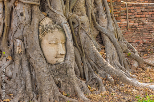Buddha head embedded in a Banyan Tree in Ayutthaya, Thailand