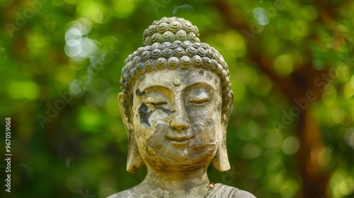 Buddha head statue with green forest background