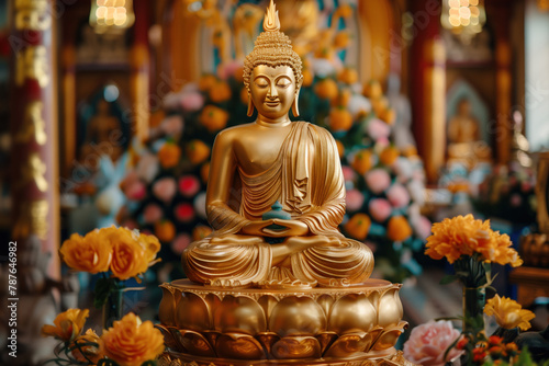 Buddha in lotus position meditation in temple decorated with flowers. Holiday Buddha's Birthday. Buddhism concept
