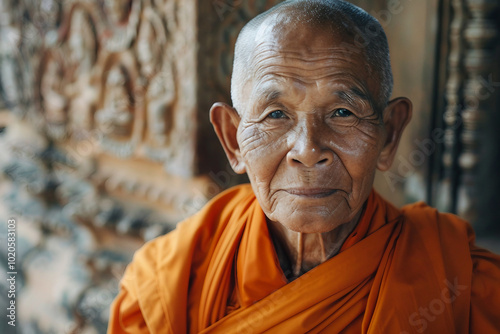 Buddhist monk in orange robes meditating in prayer for peace generative AI technology