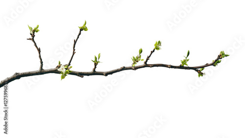 Budding Branch in Spring: A delicate tree branch with fresh, vibrant green buds against a clean, light background, heralding the arrival of spring.