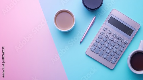 Budget flat lay with laptop notebook calculator smartphone coffee cup glasses and financial statement reports on blush pink to sky blue gradient pastel background