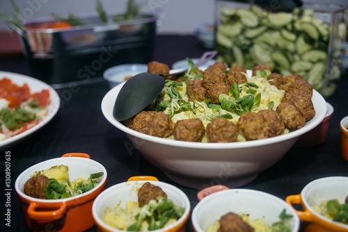 Buffet table features bowls of meatballs and pasta, alongside other dishes, ready for guests.