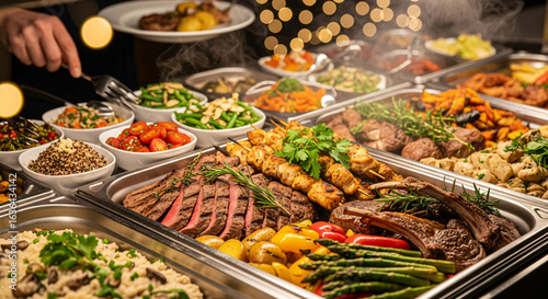 Buffet table with assorted hot dishes and grilled meats at catering event