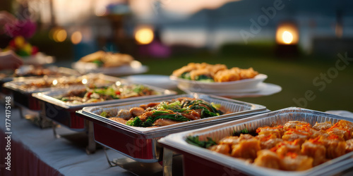 Buffet table with warm chafing dishes of Asian catering food at outdoor evening event, inviting atmosphere and glowing lights