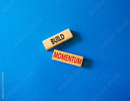 Build momentum symbol. Wooden blocks with words Build momentum. Beautiful blue background. Business and Build momentum concept. Copy space.