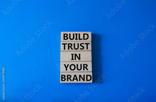 Build trust in your brand symbol. Wooden blocks with words Build trust in your brand. Beautiful blue background. Business and Build trust in your brand concept. Copy space.