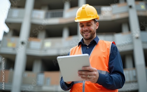 builder in hardhat with tablet pc at construction. High quality