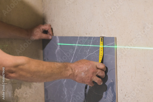 Builder is measures the repair lines for laying tiles using a laser level with green beams. Close up.