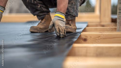 Builder meticulously lays a black waterproof membrane over wooden beams, ensuring a solid foundation for construction in a hands-on approach. Close-up.