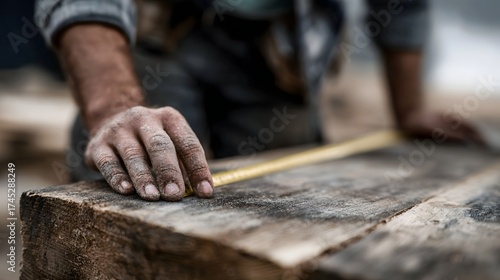 Builder s hands measuring a wooden plank with a tape measure
