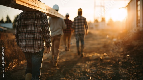 Builders at Sunset: A dedicated construction team works through the day, carrying a wooden beam and building a strong community, walking towards the warm glow of the setting sun.