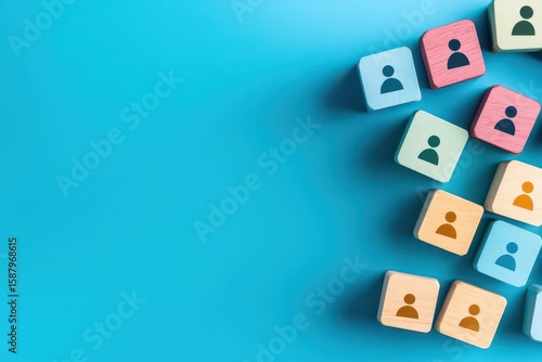 Building a strong team, Wooden blocks with people icon on blue background, Human resources and management concept