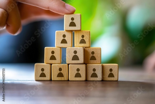 Building a Successful Team: A hand carefully places a wooden block with a human icon on top of a pyramid structure, symbolizing the foundation and growth of a strong, collaborative team.