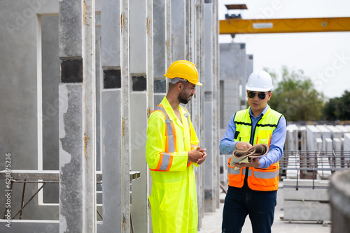 building and construction worker, Hiapanic latin male wearing safety hard hat helmet standing at Prefabricated concrete walls Industry Manufacturing Factory. Unity and teamwork