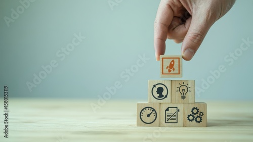 Building Blocks of Success Conceptual Hand Placing Rocket Icon on Pyramid of Business Symbols