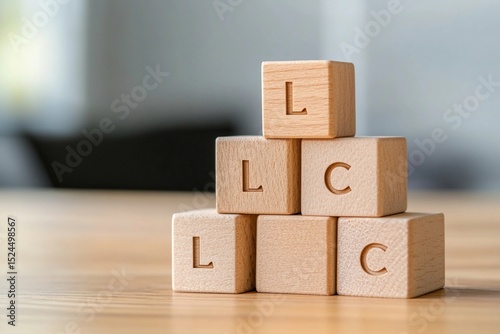 Building blocks spelling LLC in a creative arrangement on a wooden table at a bright indoor setting, limited liability company concept