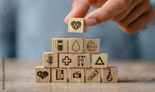 Building Healthcare Pyramid with Wooden Medical Icon Blocks – Generative AI