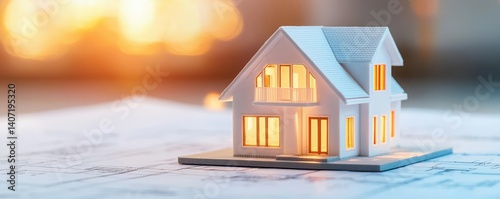 Building house on blueprint highlighting dwelling and project concept. A miniature house model illuminated on a blueprint backdrop.