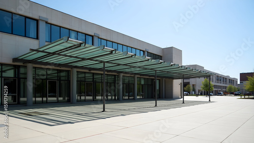 Building Modernist building with long glass canopy extending into plaza, casting patterns of shadow over pavement. (2).jpg