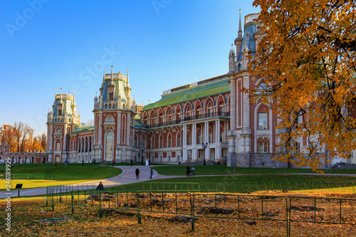 Building of Grand palace on a background of green lawn and blue sky in Tsaritsyno park in Moscow at sunny autumn day