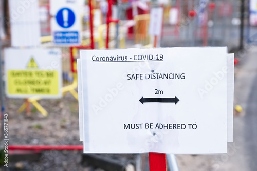 Building site open with covid-19 safety sign at entrance