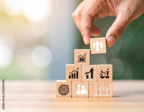 Building Success Hand Placing Teamwork Block Atop Growth Pyramid.
