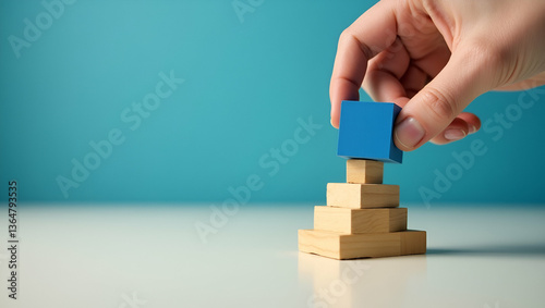 Building Success Step by Step: Hand Placing Blue Wood Cube on Pyramid Symbolizes Systematic Planning for Professional Growth and Workplace Achievements - Stock Photo Concept